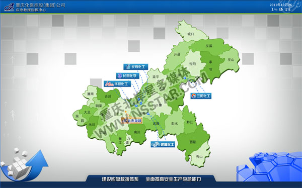 本軟件應(yīng)用于重慶化醫(yī)集團(tuán)總部應(yīng)急救援指揮中心,操作便捷,一目了然,功能清晰,配合LED大屏幕指揮旗下眾多子公司應(yīng)急救援系統(tǒng)。