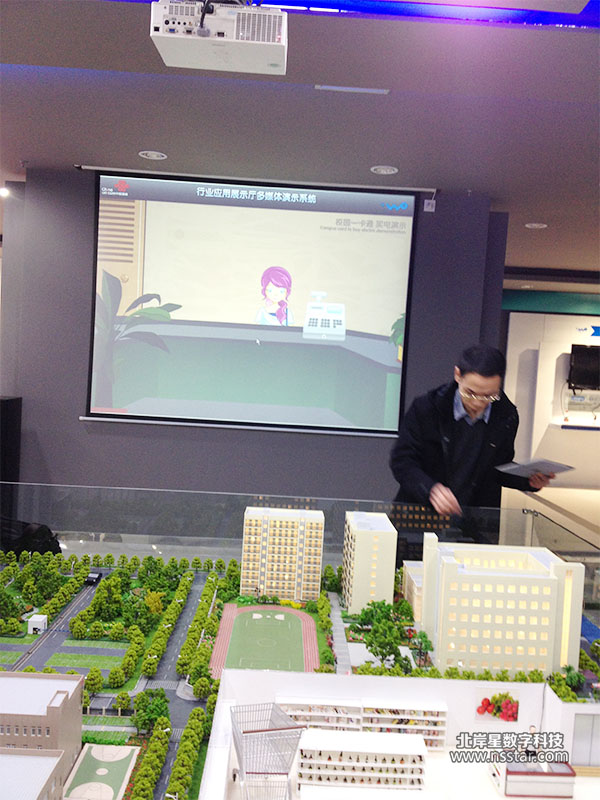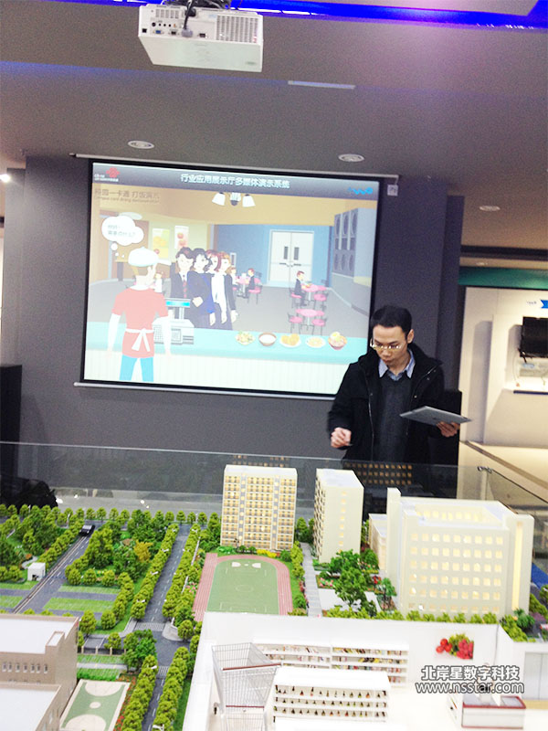 沙盤上一部分區(qū)域是學(xué)校的模型,在沙盤上教學(xué)樓的、操場、圍墻等處安裝攝像頭。在圍墻處設(shè)置紅外感應(yīng)系統(tǒng)。ipad中控系統(tǒng)點擊“平安校園”按鈕,大屏幕畫面切換到校園視頻監(jiān)控系統(tǒng)。當(dāng)操作員拿起一個“模型小人”翻過沙盤上校園的圍墻時,屏幕上的監(jiān)控系統(tǒng)會自動報警并發(fā)出警告聲,系統(tǒng)會自動連續(xù)抓拍翻墻過程的照片,并保存至電腦硬盤。