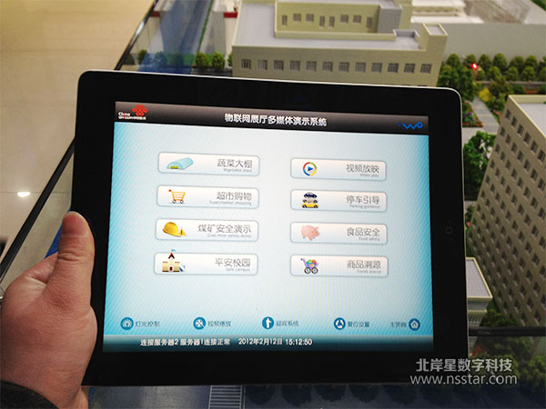 系統(tǒng)主要包含的演示控制軟件有:迎賓自動識別簽到系統(tǒng)、視頻放映廳、蔬菜大棚、豬肉食品溯源、煤礦安全系統(tǒng)演示、停車引導(dǎo)系統(tǒng)、商品溯源系統(tǒng)、超市購物系統(tǒng)、校園一卡通、校園入侵檢測等應(yīng)用演示。使用到的技術(shù)主要有:蘋果ipad平板電腦控制展廳內(nèi)所有應(yīng)用演示、多臺服務(wù)器及軟件、展廳及沙盤燈光、投影機(jī)演示;RFID即時讀取信息、沙盤溫度濕度傳感器、視頻監(jiān)控數(shù)據(jù)實時傳輸與拍照,報警等功能,并能和沙盤及投影機(jī)、ipad形成互動等多方面展示內(nèi)容。