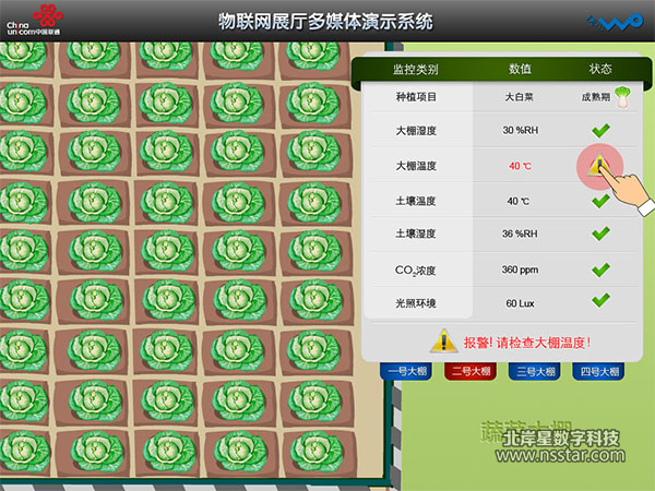 “蔬菜大棚”智能監(jiān)控系統(tǒng)演示:點擊iPad中控系統(tǒng)上的“蔬菜大棚演示”按鈕,投影畫面自動切到蔬菜大棚顯示界面。并調(diào)用沙盤上的實時數(shù)據(jù)(如濕度、溫度等)顯示在屏幕上。如果濕度過低,系統(tǒng)自動報警,提示到大屏幕上,音響系統(tǒng)出現(xiàn)報警聲音。當(dāng)操作員點擊“噴水”按鈕,沙盤上的噴頭會自動噴水到蔬菜上,當(dāng)濕度到達(dá)預(yù)定值時,噴頭自動停止噴水,數(shù)據(jù)恢復(fù)正常。溫度控制系統(tǒng)的原理和濕度一樣,當(dāng)溫度過低,系統(tǒng)會提示打開燈光。