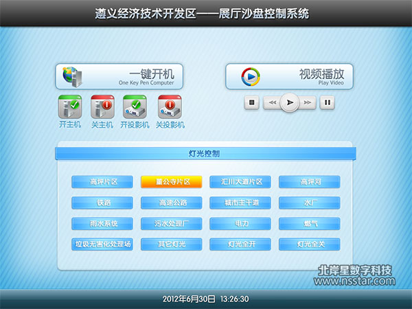 本系統(tǒng)采用蘋果iPad平板電腦控制展廳內(nèi)的所有數(shù)字設(shè)備,包括17米寬的投影拼接弧幕、100多平方的投影沙盤、以及燈光控制、主機控制等。
