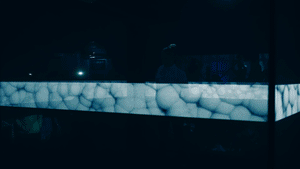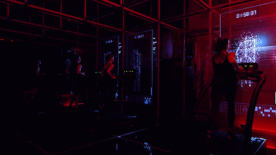 在這個空間內(nèi)安放了8臺跑步機,Monomango團隊對跑步機進行了改造并開發(fā)了一個互動場景,他們在每個跑步機前配備了一個全息投影,觀眾的跑步動作會被實時追蹤并以全息投影的形式呈現(xiàn)在體驗者面前。除此之外,體驗者還可以感受到目前世界上跑得最快馬拉松運動員Eliud Kipchoge的跑步速度,以此增加運動的趣味性。