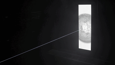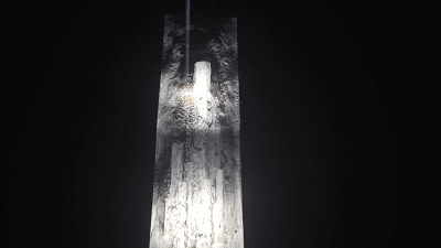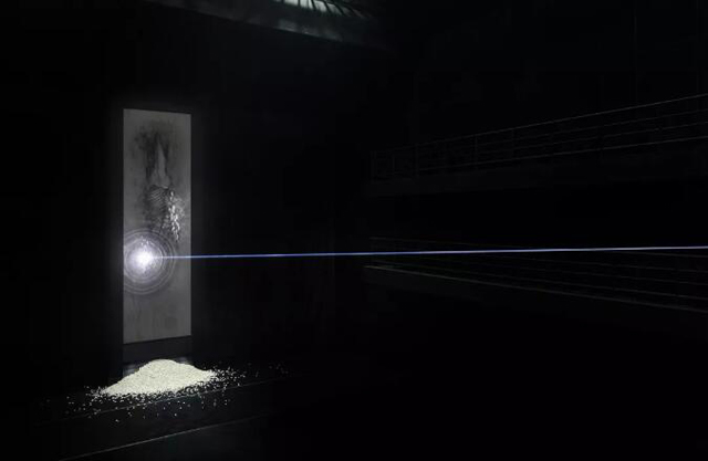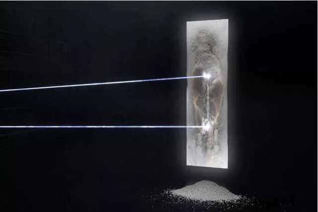 投影的后方安裝有動能裝置,動能裝置則與投影畫面、激光、相互配合。激光雕刻畫面時會排出廢棄石塊,如同歲月的積累,讓人感嘆自然地質(zhì)化腐朽為神奇的力量。