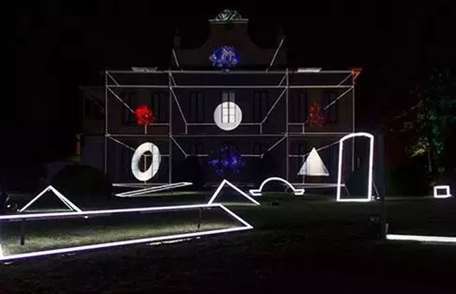 在巴塞羅那德國(guó)館內(nèi)設(shè)置的“燈光幾何”基于建筑的特點(diǎn),在建筑上把紅色激光投射成了大理石原本組合的網(wǎng)格狀方式。由于光可以透過(guò)玻璃,建筑的邊界因此有了進(jìn)一步擴(kuò)展,達(dá)成了另一種層面的“流動(dòng)空間”。