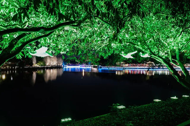 玉湖燈光秀周圍的山體、湖岸、園林、橋梁、亭臺(tái)樓閣,也按最佳觀賞點(diǎn)來確定亮度的層次劃分,對(duì)公園、廣場(chǎng)、周邊建筑、橋梁、湖岸、雕塑等進(jìn)行了全要素的亮化提升,給予市民一個(gè)全新的夜景體驗(yàn)。