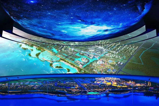 全新升級(jí)改造后,規(guī)劃館沙盤區(qū)LED面積增加超過3倍,沙盤大屏由原來的118度升級(jí)為180度,橫向兩側(cè)各增加9米,形成總長(zhǎng)約50米的戶型屏幕,增加球幕與環(huán)幕的銜接,頂幕畫面呈現(xiàn)方式升級(jí)為L(zhǎng)ED,整體營(yíng)造出最為震撼的視覺效果。