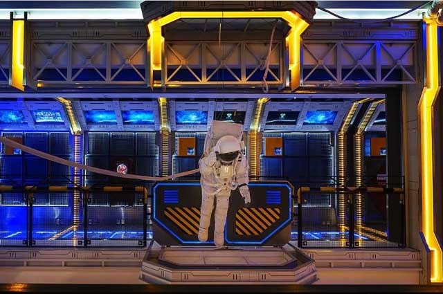 走進(jìn)影城,開啟一場別開生面的太空穿越。懸掛的宇航員,地面的芯片電路板等科技感十足的“異類空間”,瞬間征服相機快門。