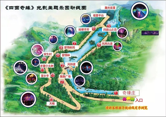 通過策劃設(shè)計(jì)的投影方案,做到完全保護(hù)景區(qū)原始景觀的前提下,將懸崖峭壁、飛流瀑布,螢火森林等壯觀景色在夜色中綻放出另一番意境。根據(jù)“愛情天梯”的情節(jié)發(fā)展,故事動(dòng)線1.4公里,沿動(dòng)線分為13個(gè)故事節(jié)點(diǎn),設(shè)置24處光影應(yīng)用,游園約1.5h-2h,打造出“動(dòng)靜結(jié)合、虛實(shí)結(jié)合、情景結(jié)合”的行走探險(xiǎn)式光影交互體驗(yàn)。