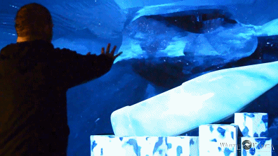 這不是一場只能觀看的投影秀,出了觀看體驗者還可以與投影動畫進(jìn)行互動。在深海投影環(huán)節(jié),一只水母在礦泉瓶內(nèi)游動,體驗者可以伸手?jǐn)[動控制水母怎么移動,還可雙手推動令海水瞬間結(jié)冰。