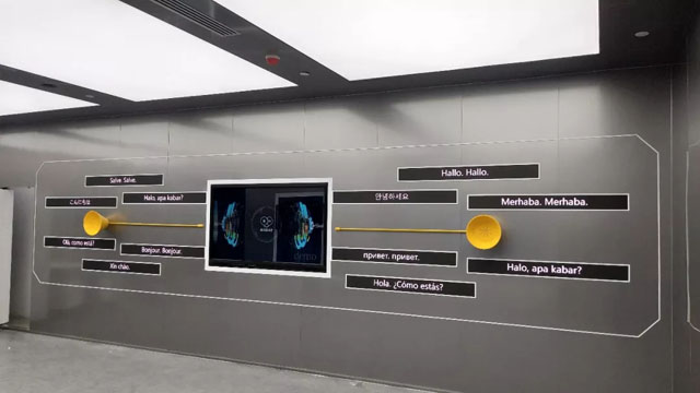 騰訊展廳內(nèi)AI同聲互譯大放異彩,創(chuàng)意條形屏設計用以顯示全球十二國不同語言,搭承騰訊語言翻譯系統(tǒng),讓所有參觀者體驗同聲傳譯交流的快感,讓溝通無國界、交流無障礙,用獨特的展現(xiàn)形式將騰訊翻譯君產(chǎn)品特性更直觀呈現(xiàn)。
