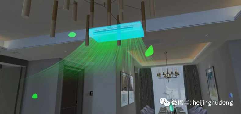 體驗(yàn)者看到畫面中被具象化的二氧化碳,通過語音提示、綠色光帶看到空調(diào)新風(fēng)的散入,將其 "新風(fēng)自潔凈"的功能、以及其“熱交換與處理”技術(shù)轉(zhuǎn)換為肉眼可見的畫面,這時(shí)再通過語音提示將優(yōu)勢(shì)進(jìn)行總括,體驗(yàn)者便可輕松理解,在潛移默化中達(dá)成認(rèn)同。