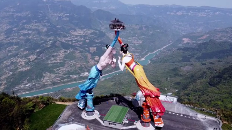 其造型靈感來(lái)自于武隆民間傳說(shuō)——白馬王子敖嘲風(fēng)與茶仙女的愛(ài)情故事為原型。極具震撼的造型外,還具有令人驚嘆的科技含量,游客可通過(guò)機(jī)械臂上升52米,站在千米高空的玻璃平臺(tái)上,通過(guò)機(jī)械臂的旋轉(zhuǎn),體驗(yàn)飛翔在白馬山上的感受,一覽白馬山美景。