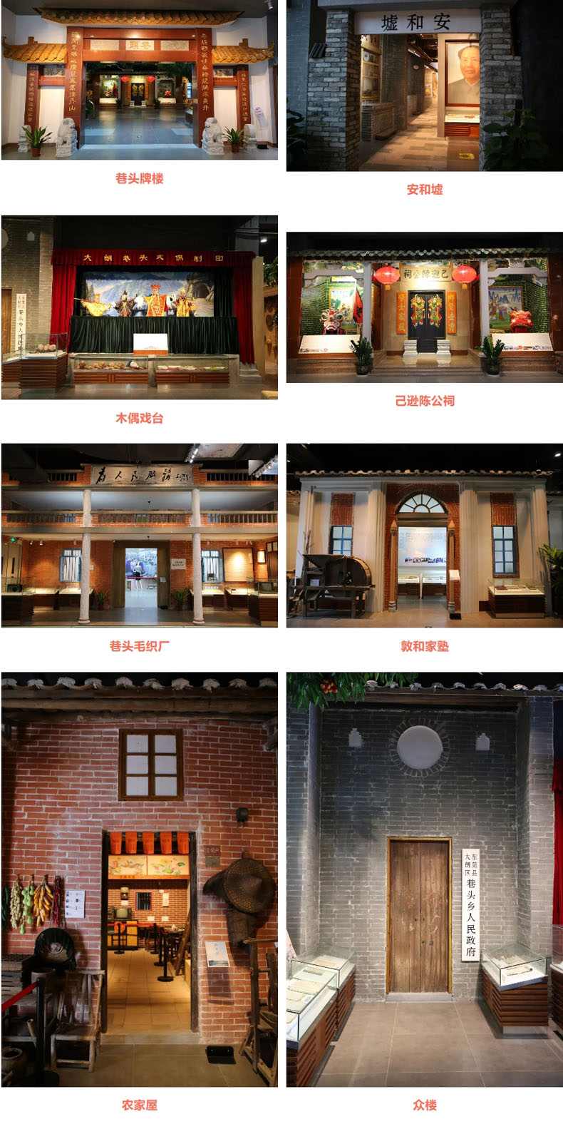 復(fù)原巷頭牌樓、安和墟、農(nóng)家屋、木偶戲臺(tái)、眾樓、己遜陳公祠、敦和家塾,巷頭毛織廠等主題景觀、全面地反映了巷頭社區(qū)建國(guó)以來政治、經(jīng)濟(jì)、文化的發(fā)展歷程。