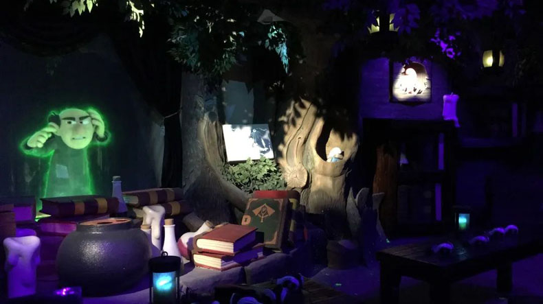 在“勇闖魔音亭”項目中,為了讓游客體驗“真實”的“藍精靈世界”,項目采用高新投影及成像技術讓格格巫和藍精靈的形象“躍然紙上”。