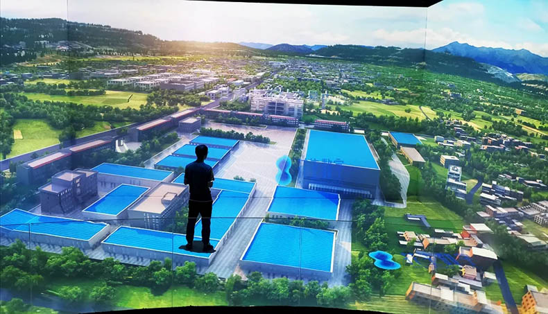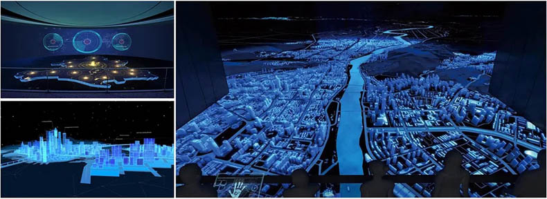 由四幅投影屏幕組成,配合數(shù)字化沙盤及內(nèi)容共同展示。比實體沙盤更具沉浸感和3D視覺效果,更能充分展示未來的規(guī)劃場景。配合聲、光、電等展示技術(shù),更具視覺沖擊效果,富有科技感,讓參觀者留下深刻的印象。
