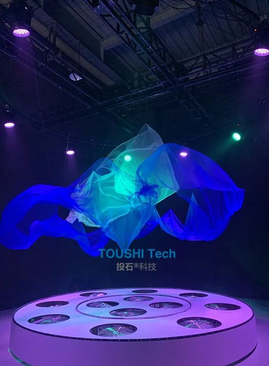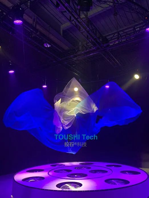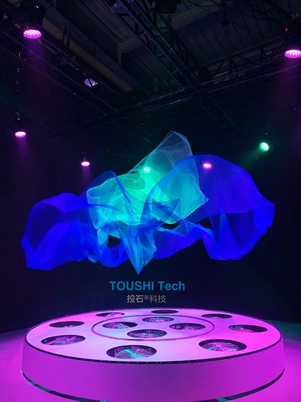 活動(dòng)中,投石科技通過(guò)對(duì)12臺(tái)電風(fēng)扇的精準(zhǔn)風(fēng)力控制內(nèi)環(huán)和外環(huán)的2塊紗幔,紗;(dòng)藝術(shù)裝置結(jié)合音樂(lè)和燈光,為觀眾帶來(lái)了一場(chǎng)實(shí)時(shí)的充滿(mǎn)藝術(shù)感的表演。