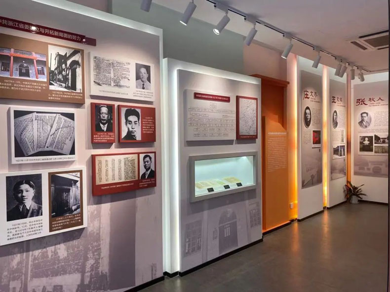 陳列室分為“力挽狂瀾”“甘灑熱血”“高舉義旗”“根脈永續(xù)”四個單元,從宏觀微觀多角度多層次重現(xiàn)歷史,再現(xiàn)當年黨組織在浙江艱苦奮斗的革命歲月與光輝歷程。在設計上,充分利用原建筑自身特色,將原建筑室內(nèi)室外綜合打造,還原浙江省委機關舊址的獨特韻味。