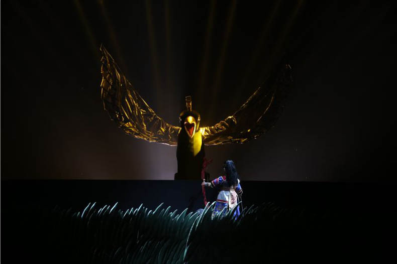 除了保留傳統(tǒng)元素,運(yùn)用現(xiàn)代科技,新版《嫦娥奔月》可謂融入眾多元素,又相得益彰。劇中,十只由真人扮演的金烏走向臺前,與觀眾零距離接觸。在嫦娥陪伴后羿踏上尋覓西王母、解救大地之路時(shí),則加入了皮影戲元素,光與影的完美演繹,將一路上的艱辛展現(xiàn)無疑。而音樂中加入了爵士樂輕快明朗,讓人不由得隨著音樂搖擺;氐侥九歼@一舞臺的核心,演員扎實(shí)的功底和出色的演出,讓人驚嘆。